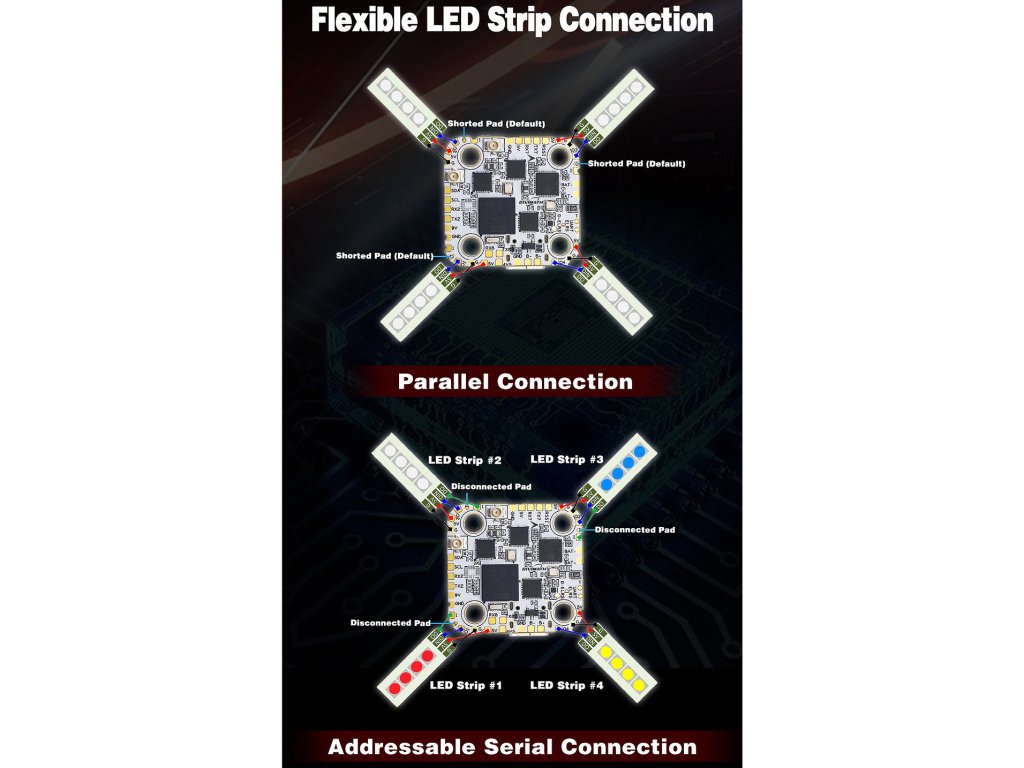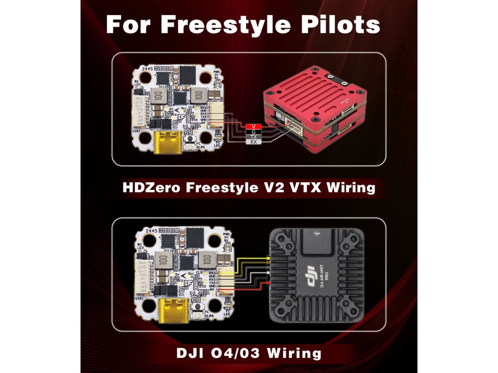 Pro napájení je k dispozici 9V/3A BEC (pro HDZero VTX s možností ovládání přes Betaflight) a 5V/4A BEC vhodný i pro výkonné LED systémy. Deska je optimalizována pro nízký profil se stackem HDZero VTX Race v3.