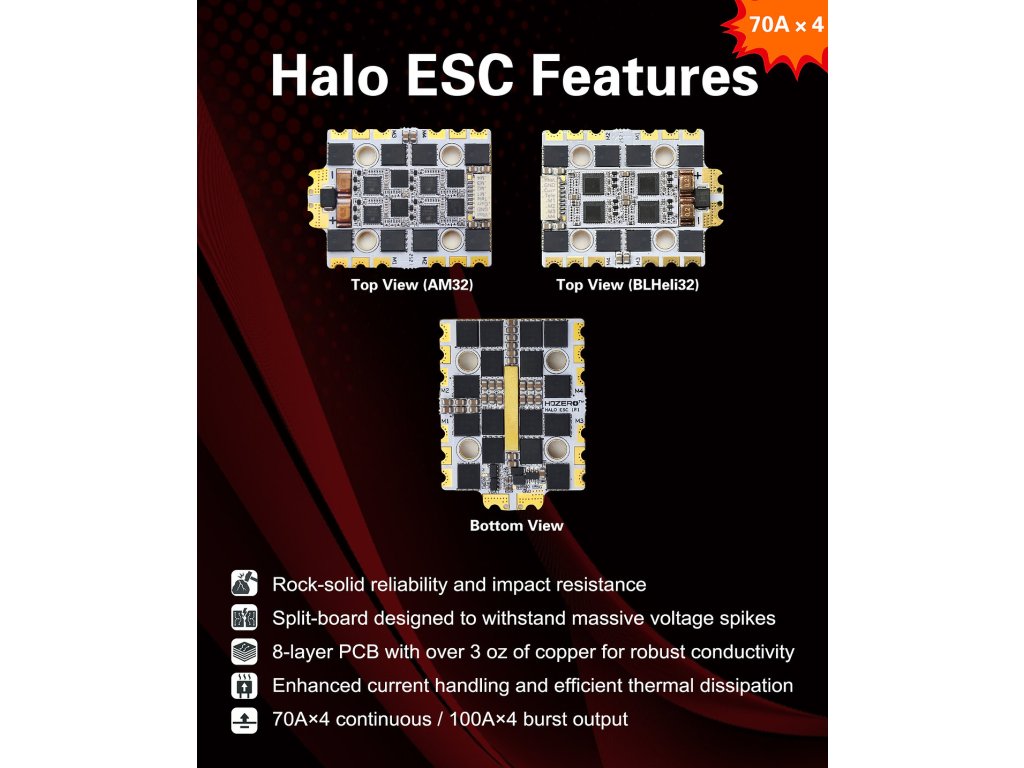 Halo 4in1 70A ESC je vyroben s důrazem na spolehlivost a efektivitu – používá dělenou desku pro oddělení řídicí a výkonové části, což zlepšuje chlazení a odolnost vůči nárazům. Se 70A trvalým a 100A špičkovým proudem na motor poskytuje okamžitou odezvu, stabilní výkon a čisté napájení. Conformal coating chrání ESC před vlhkostí, prachem a korozí.