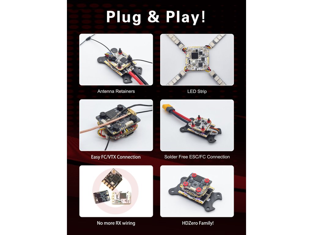 - Plug-and-play – bez pájení pro RX, VTX a ESC