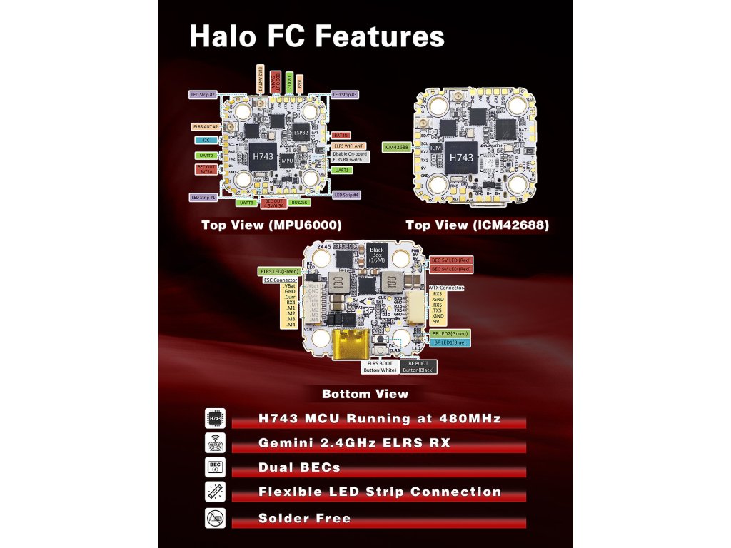 Halo Flight Controller je osazen výkonným H7 procesorem a integrovaným Gemini ELRS přijímačem s dual-diversity pro maximálně stabilní řídicí linku. Díky TXCO je zajištěna konzistentní výkonnost i v náročných teplotních podmínkách. FC nabízí plug-and-play konektory pro VTX, ESC a přijímač – bez nutnosti pájení.