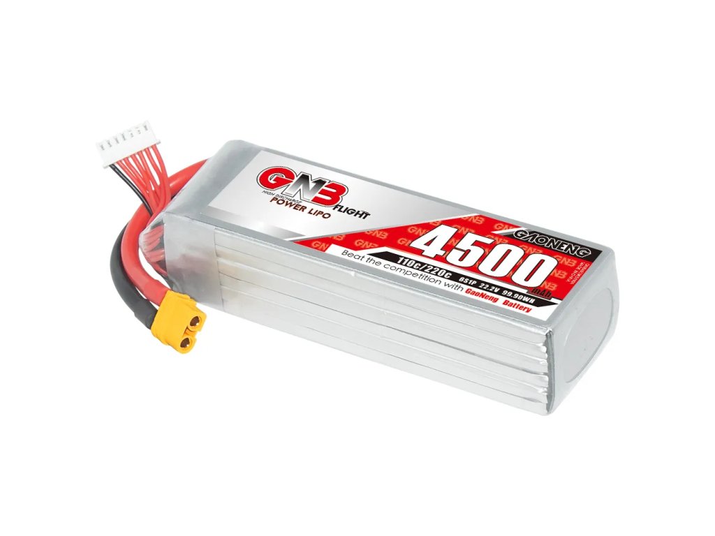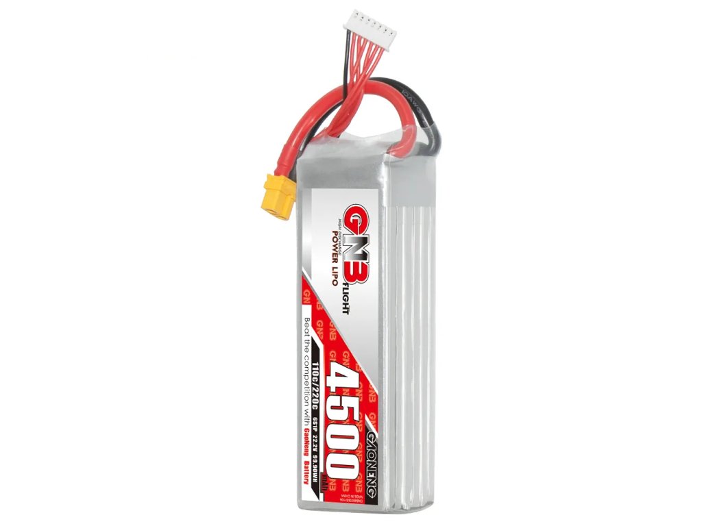 Model GNB45006S110A je špičková LiPo baterie s kapacitou 4500mAh a extrémním vybíjecím proudem 110C. Tato 6S (22.2V) baterie poskytuje mimořádný výkon pro náročné aplikace jako jsou závodní FPV drony, VTOL systémy, nebo profesionální RC zařízení. Díky XT60 konektoru a kompaktním rozměrům 141 × 44 × 52 mm nabízí vysokou hustotu energie při stále přijatelných rozměrech a hmotnosti.
