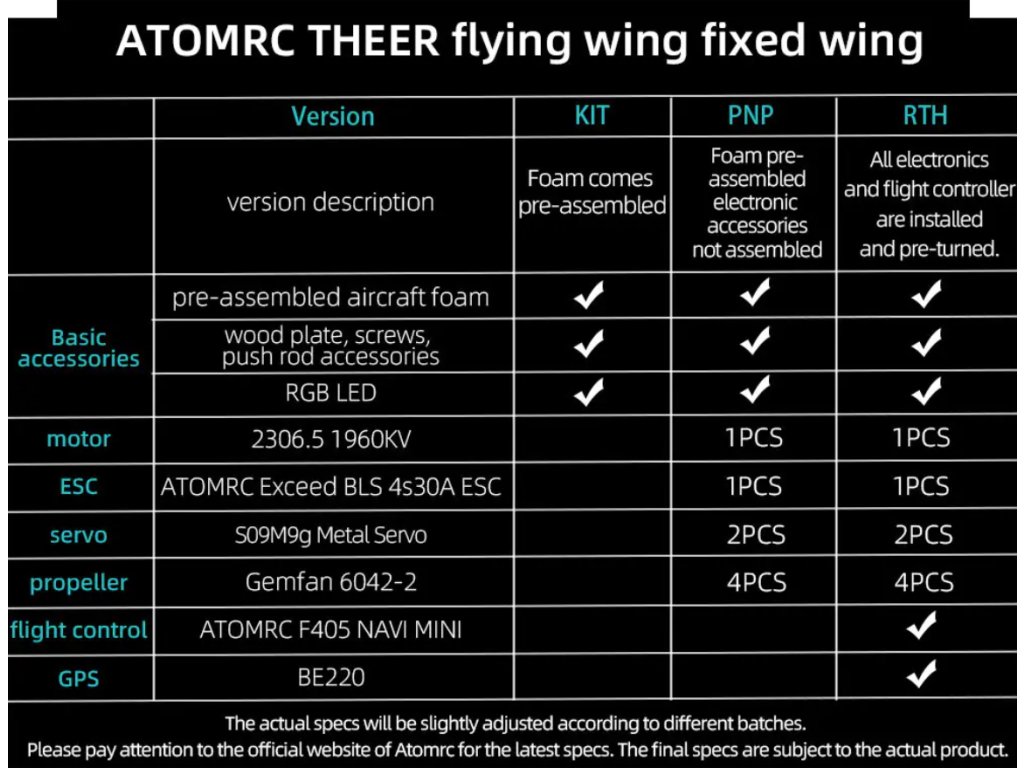 - KIT: pouze drak bez elektroniky, obsahuje pěnové díly, LED, uhlíkové výztuhy, šroubky a příslušenství.