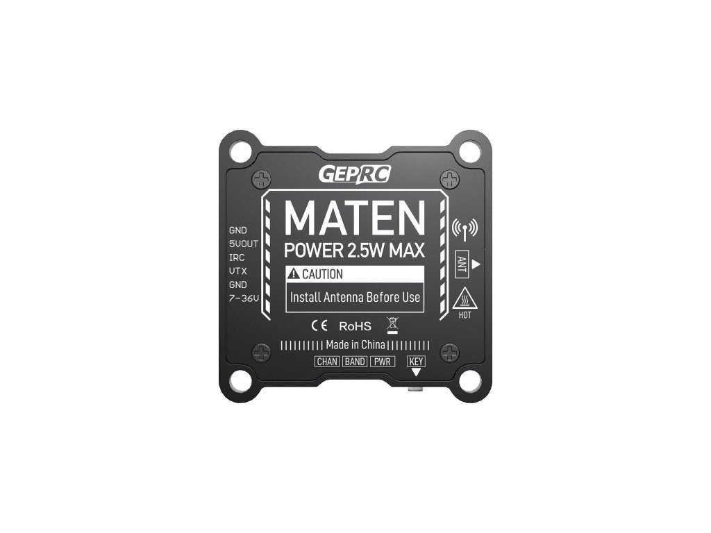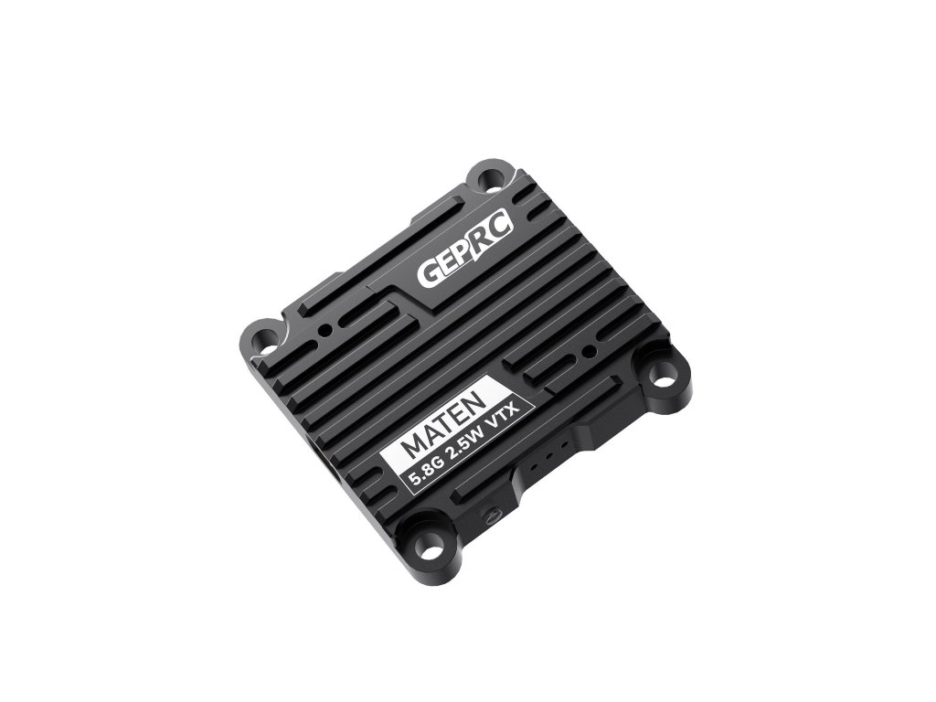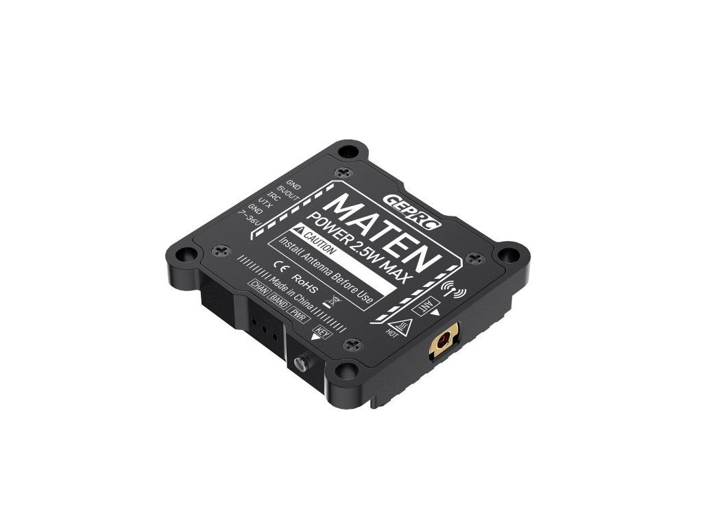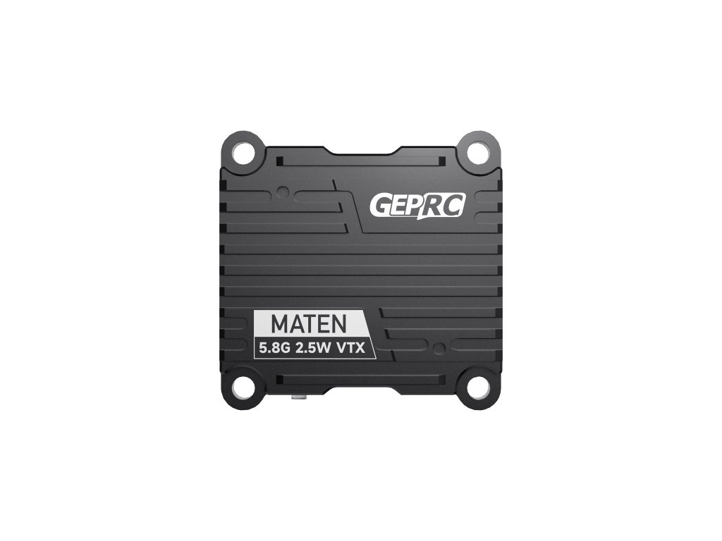 GEPRC MATEN 5.8G 2.5W VTX je výkonný analogový video vysílač navržený pro FPV piloty, kteří hledají vysoký výkon a spolehlivý signál i na dlouhé vzdálenosti. Nabízí až 2 500 mW výstupního výkonu a 5 úrovní výkonu, takže jej snadno přizpůsobíte konkrétní situaci.